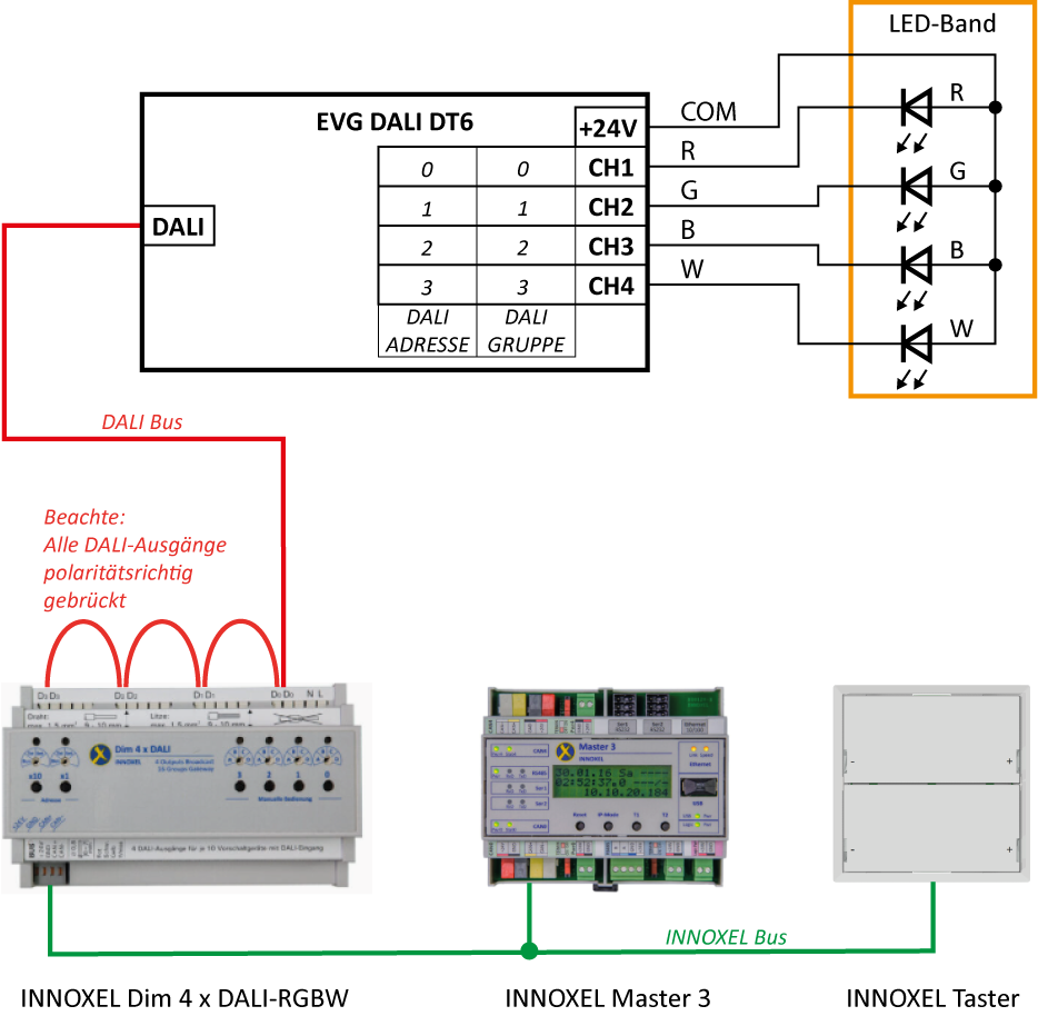 Achten Sie bitte bei der Installation darauf, dass am INNOXEL Dim 4 x DALI-RGBW alle Ausgänge polaritätsrichtig gebrückt sein müssen.